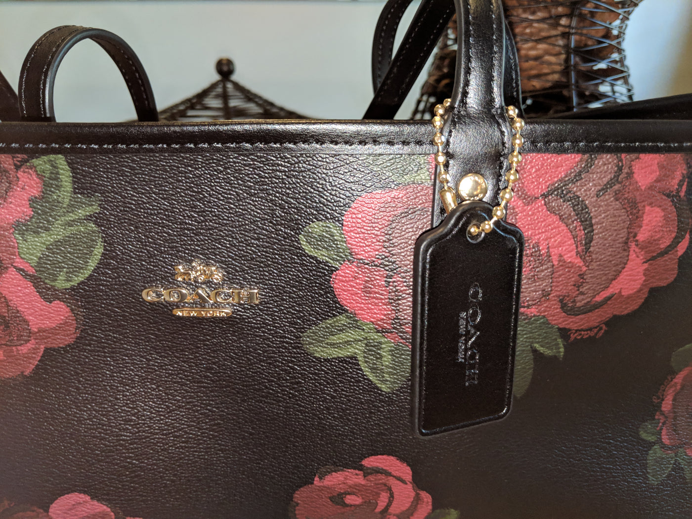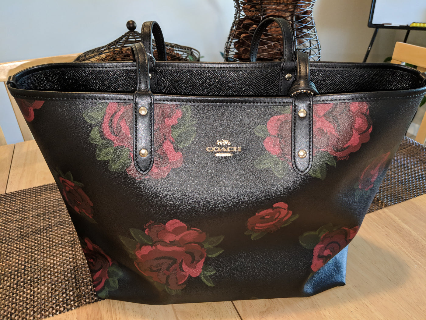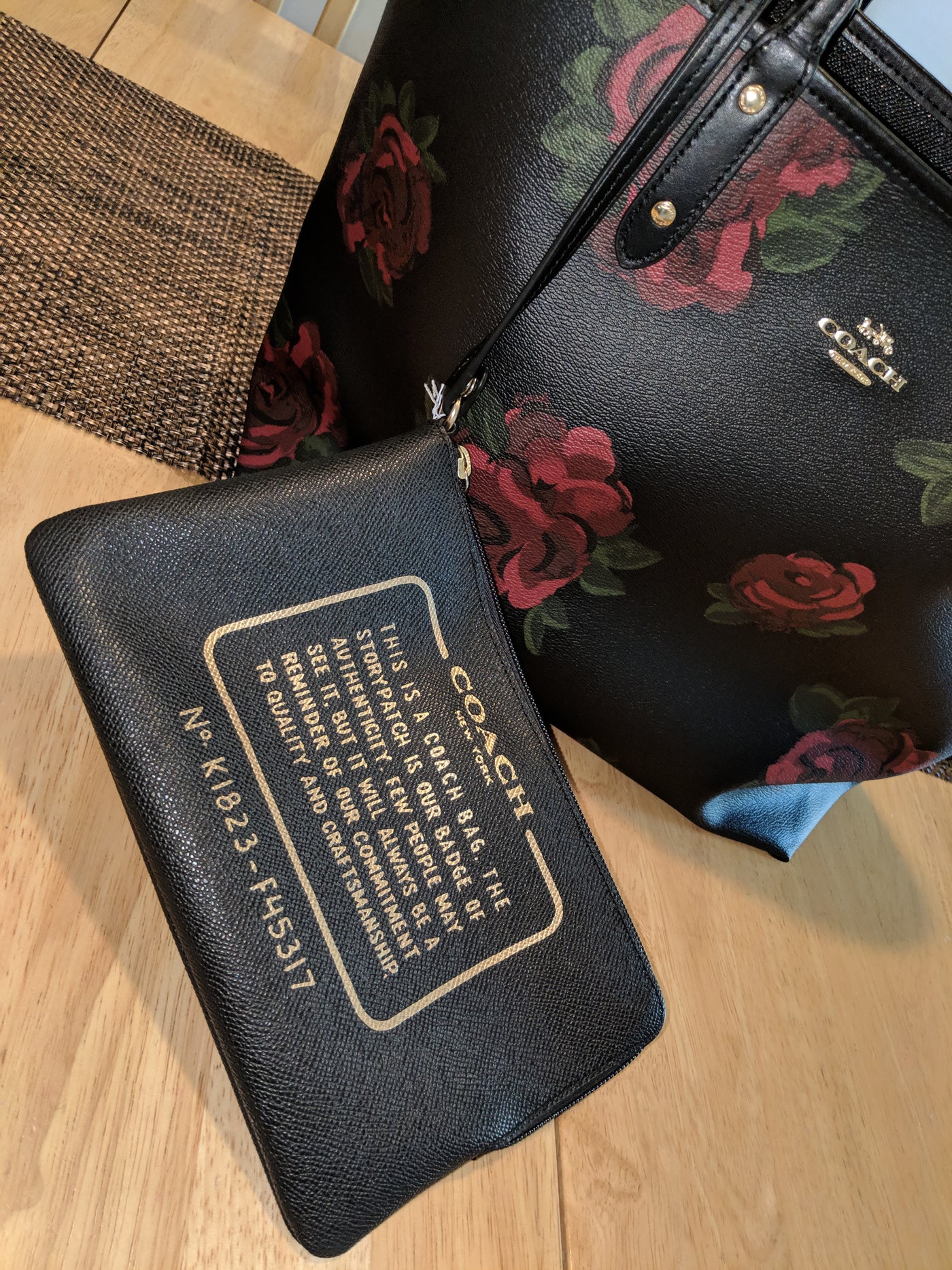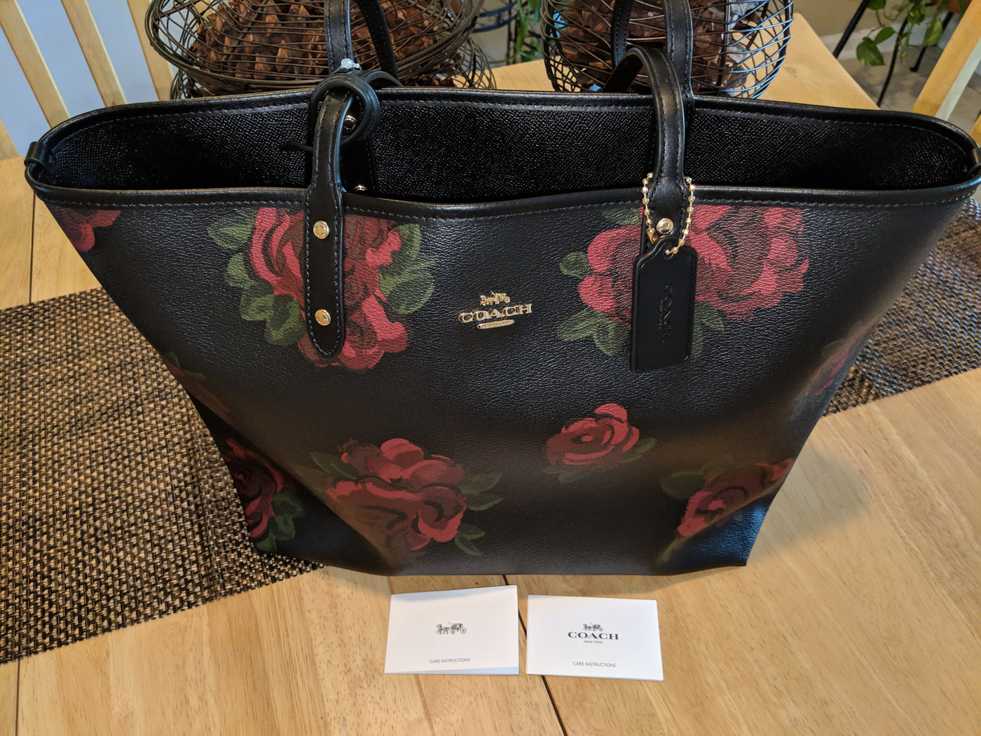 Authentic Coach Reversible Black and Red Floral Design Tote with Clutch